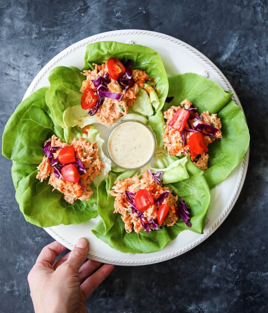 I’m always needing healthy lunch prep ideas. I’ve found that if I don’t have something semi-prepared for the week, I’ll end up snacking on a bunch of random things for lunch and come 3:00pm, I am SO starving! I love these Buffalo Chicken Salad Lettuce Cups because they are incredibly tasty and healthy, but also satisfying!