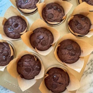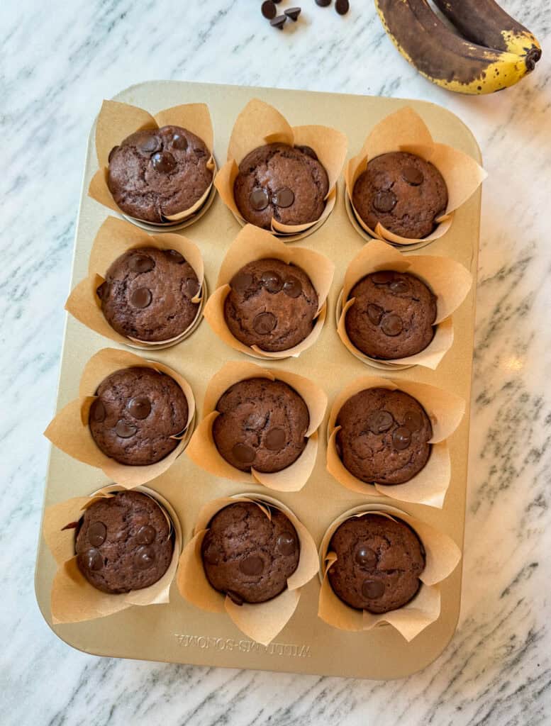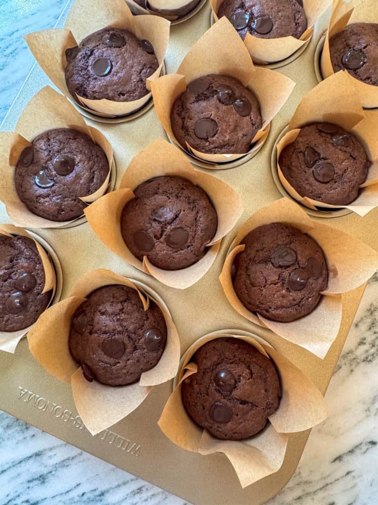 - Fold in 1/2 cup chocolate chips then add to prepared muffin pan (fill each up almost to the rim) and add remaining chocolate chips to the tops. Bake for 20-22 minutes, or until toothpick inserted comes out clean. Let cool for a few minutes and enjoy!