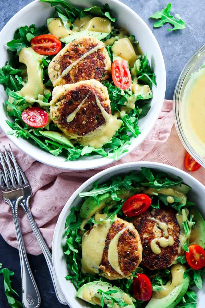 - To make the salad: Whisk olive oil, red wine vinegar, Dijon Mustard, salt and pepper in a small bowl until creamy. Add arugula, avocado, and salmon cakes to serving bowls. Drizzle with dijon vinaigrette and enjoy!!